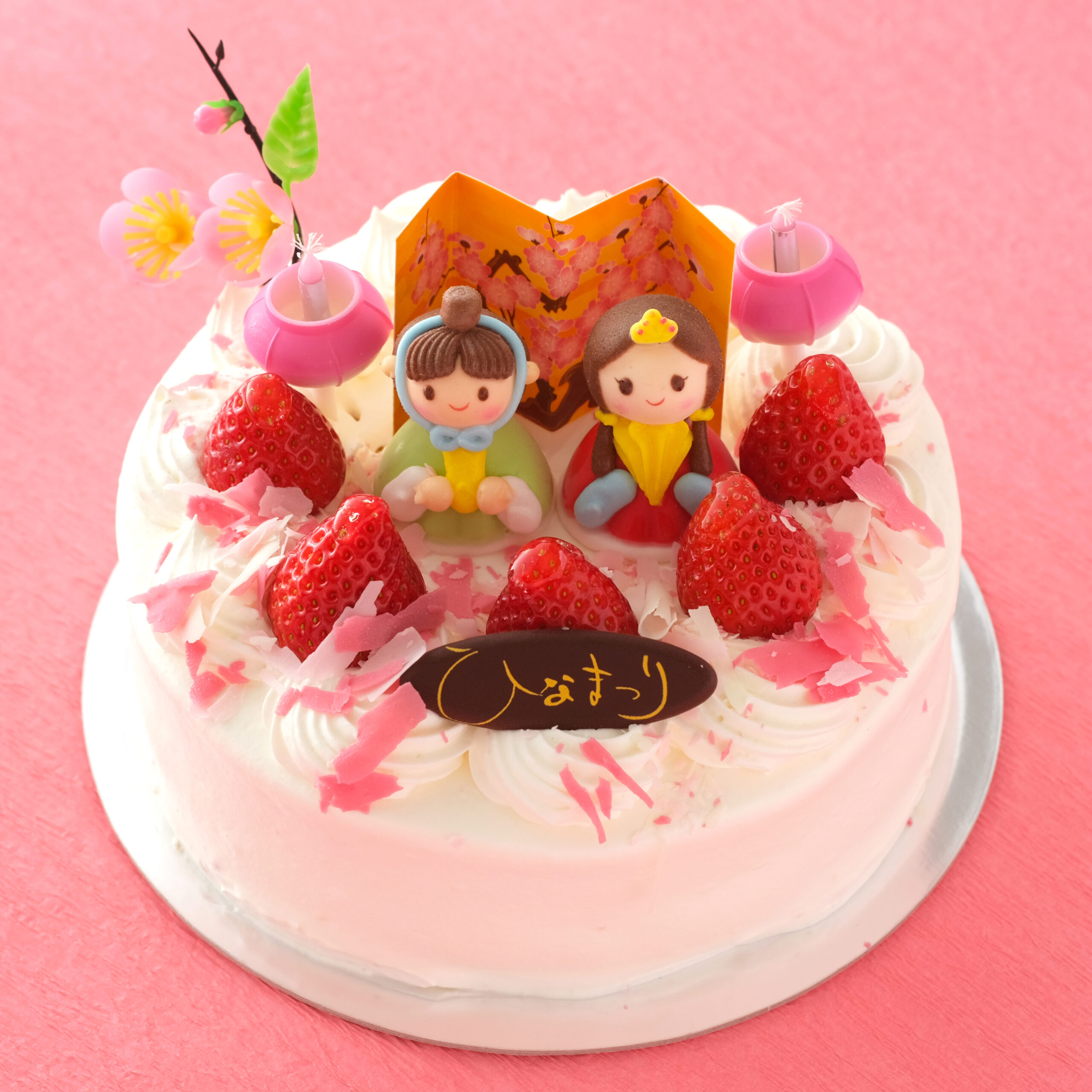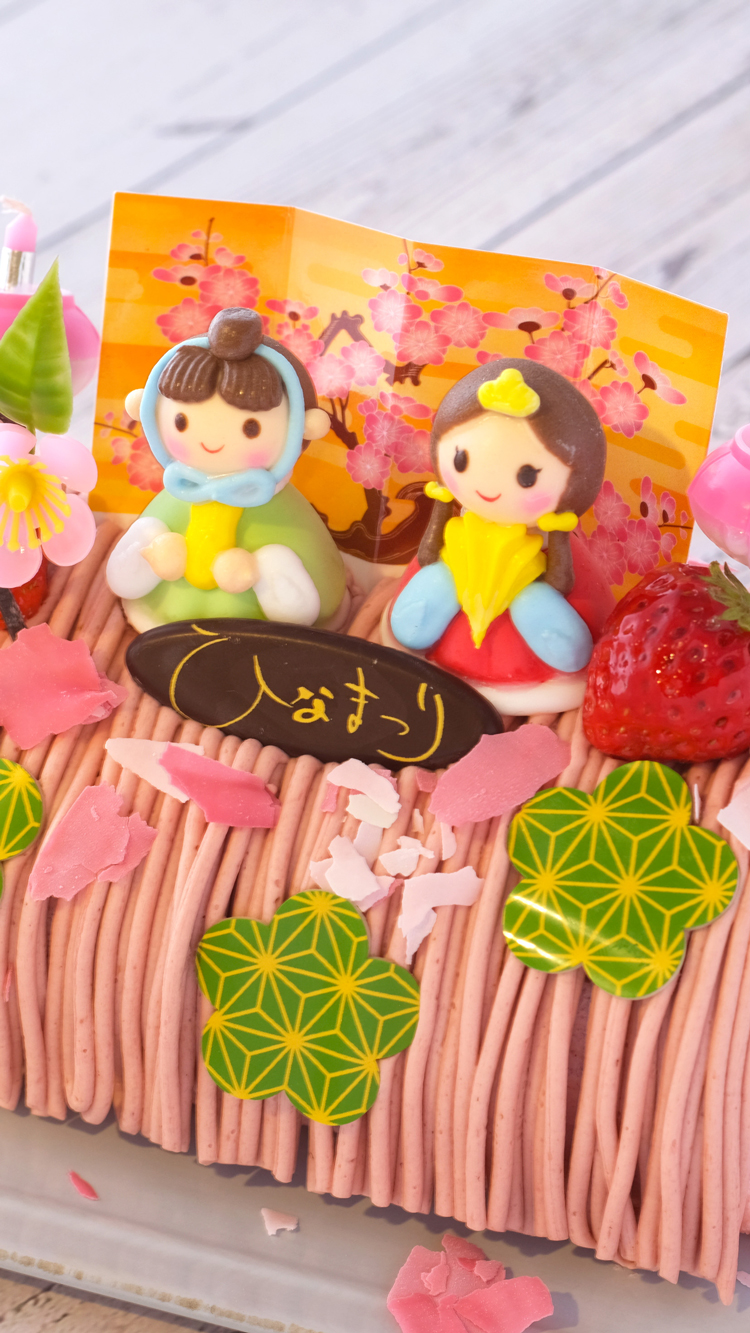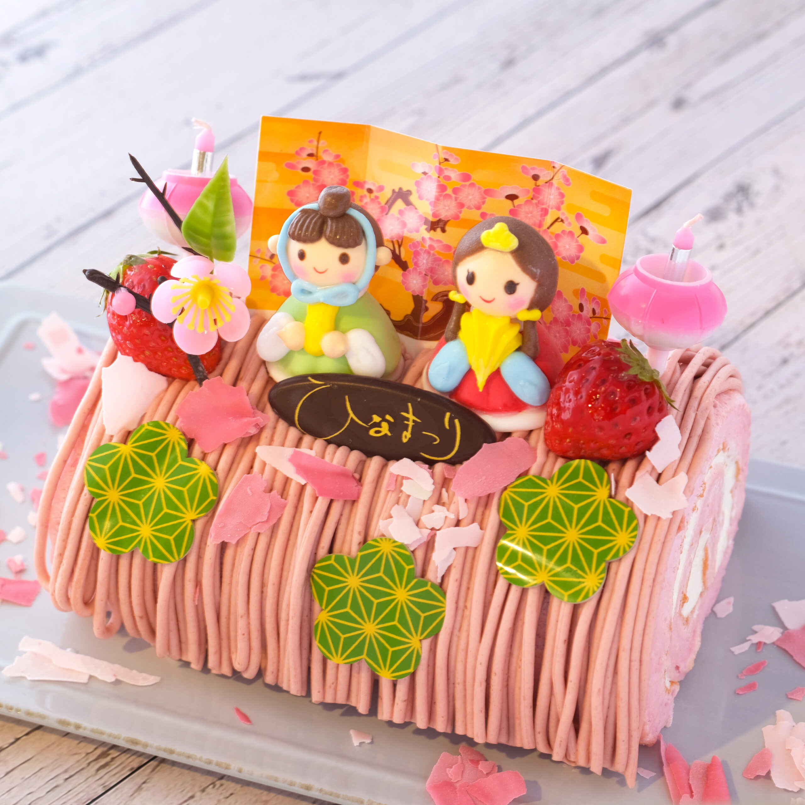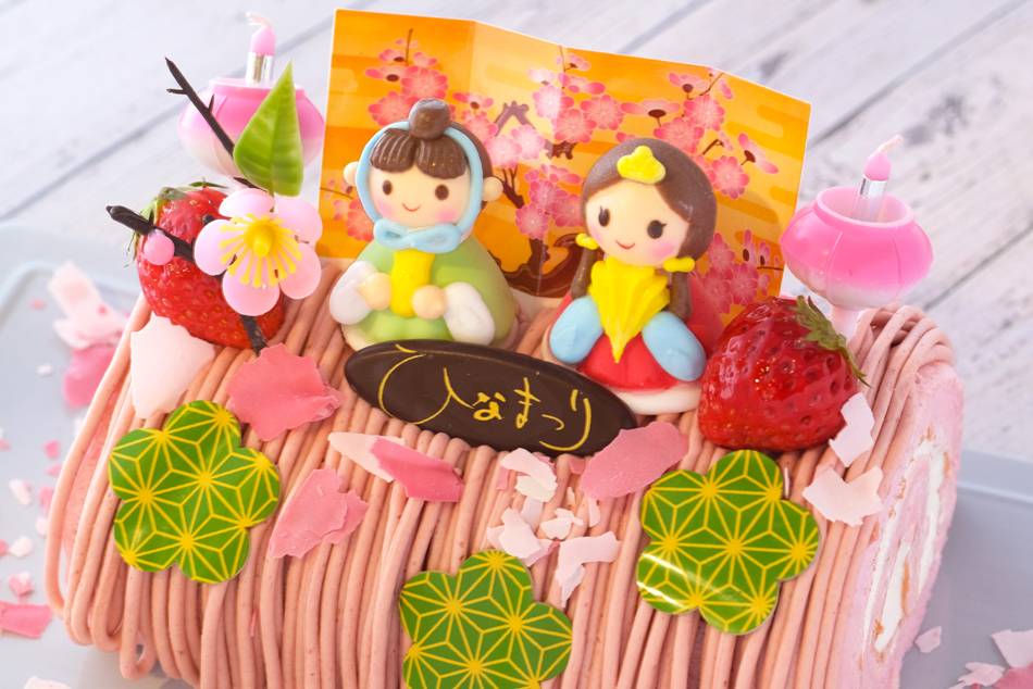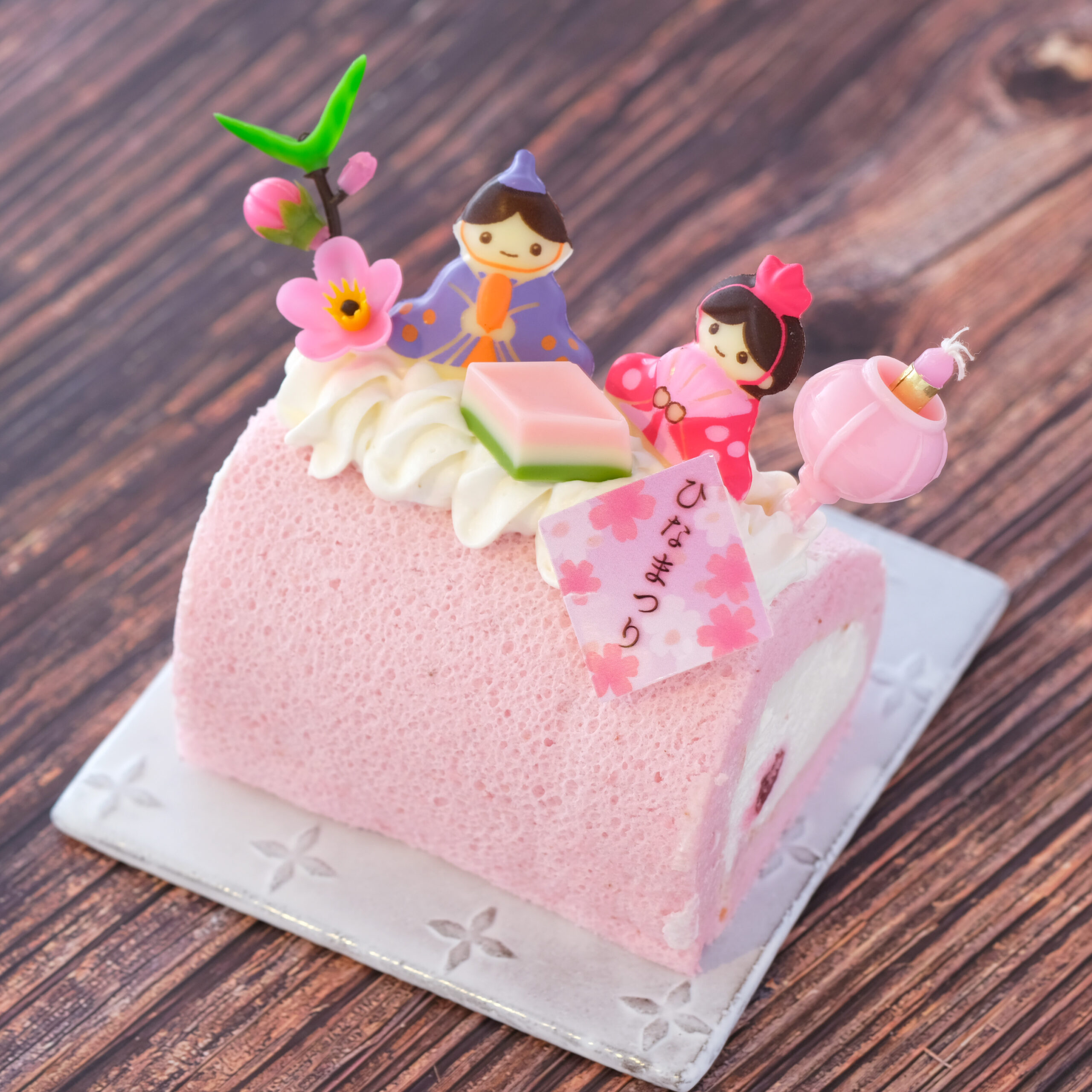 ミルキーな生クリームをピンクに色づいたいちご味のスポンジで巻き、さらにいちごのクリームとひなまつりのメレンゲなどをトッピングしました