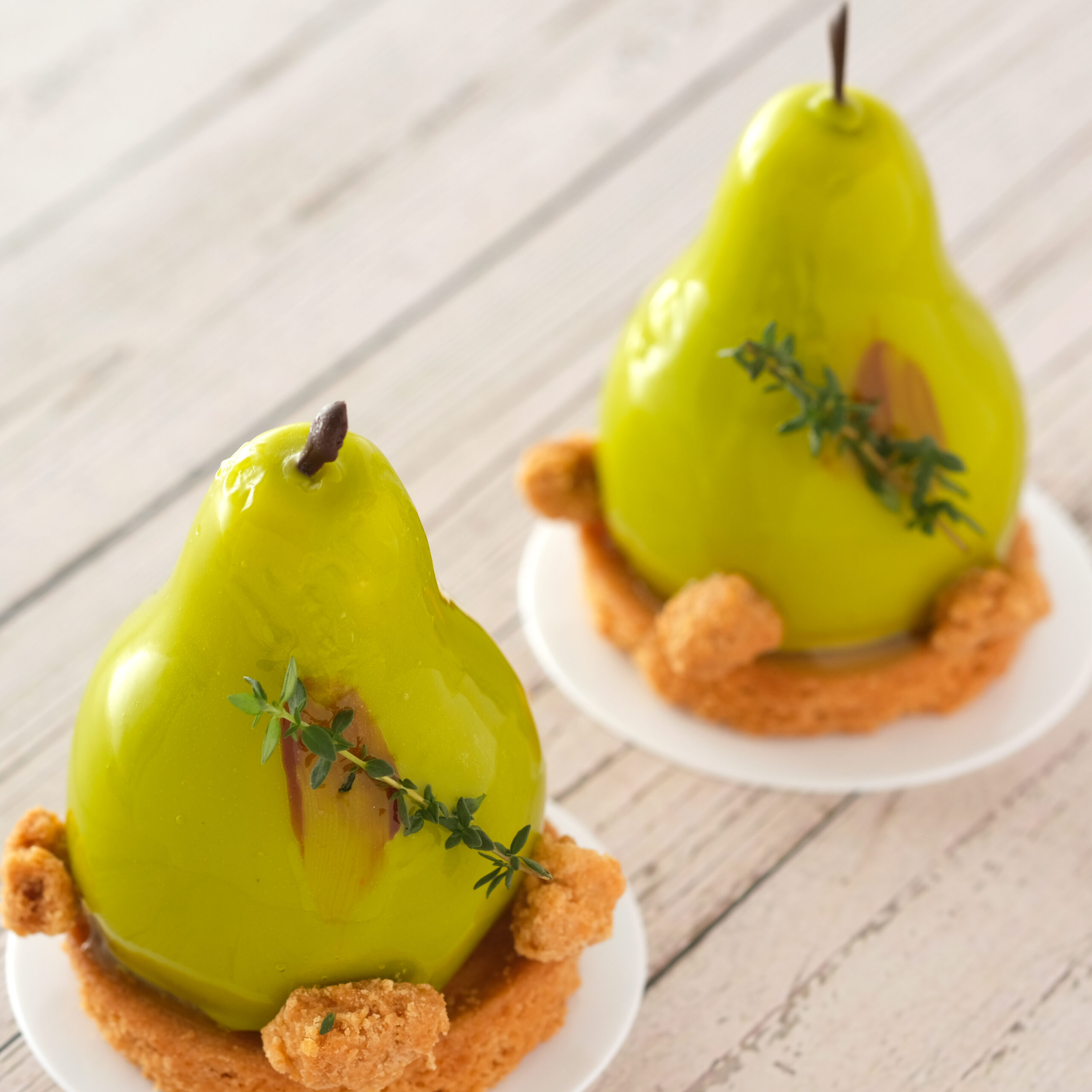 本物の洋梨のような完成度を誇る3Dのケーキ。 洋梨とホワイトチョコレートのムースの中に、洋梨のキャラメルコンポートを入れ、バターたっぷりの厚焼きサブレの上にのせました