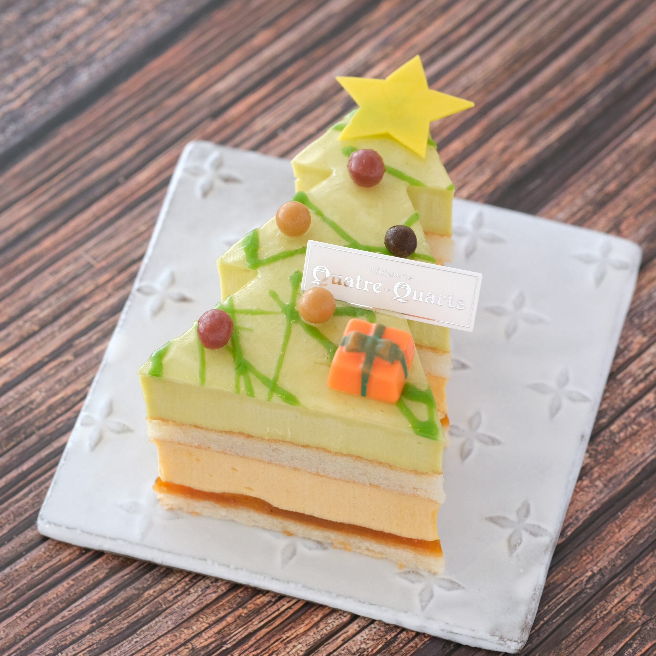 ピスタチオのムース、杏のムース&果肉入りのコンフィチュール、ダックワーズを重ねたもみの木🎄の形のケーキ