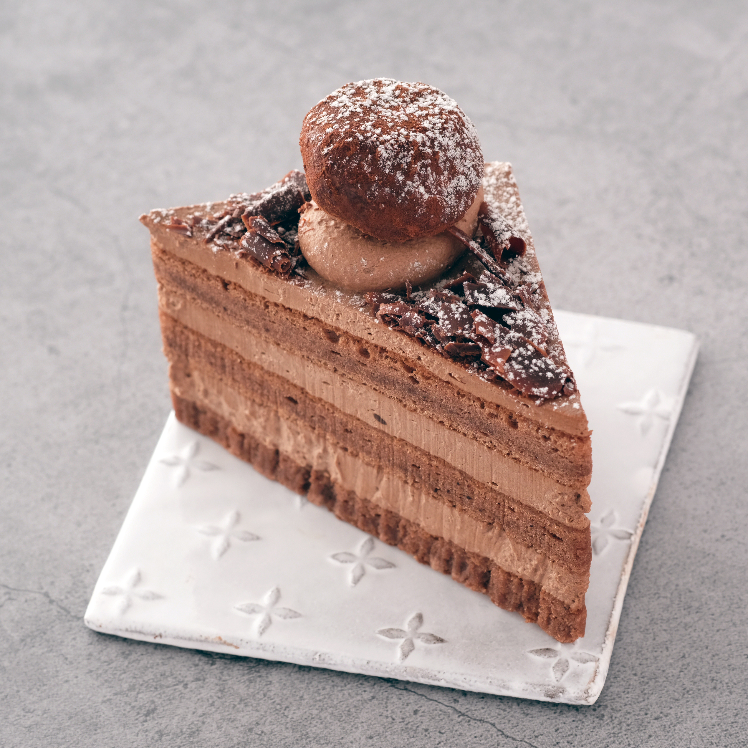 チョコレート味の生クリームとココアのスポンジを重ね、「生クリームトリュフ」をのせました