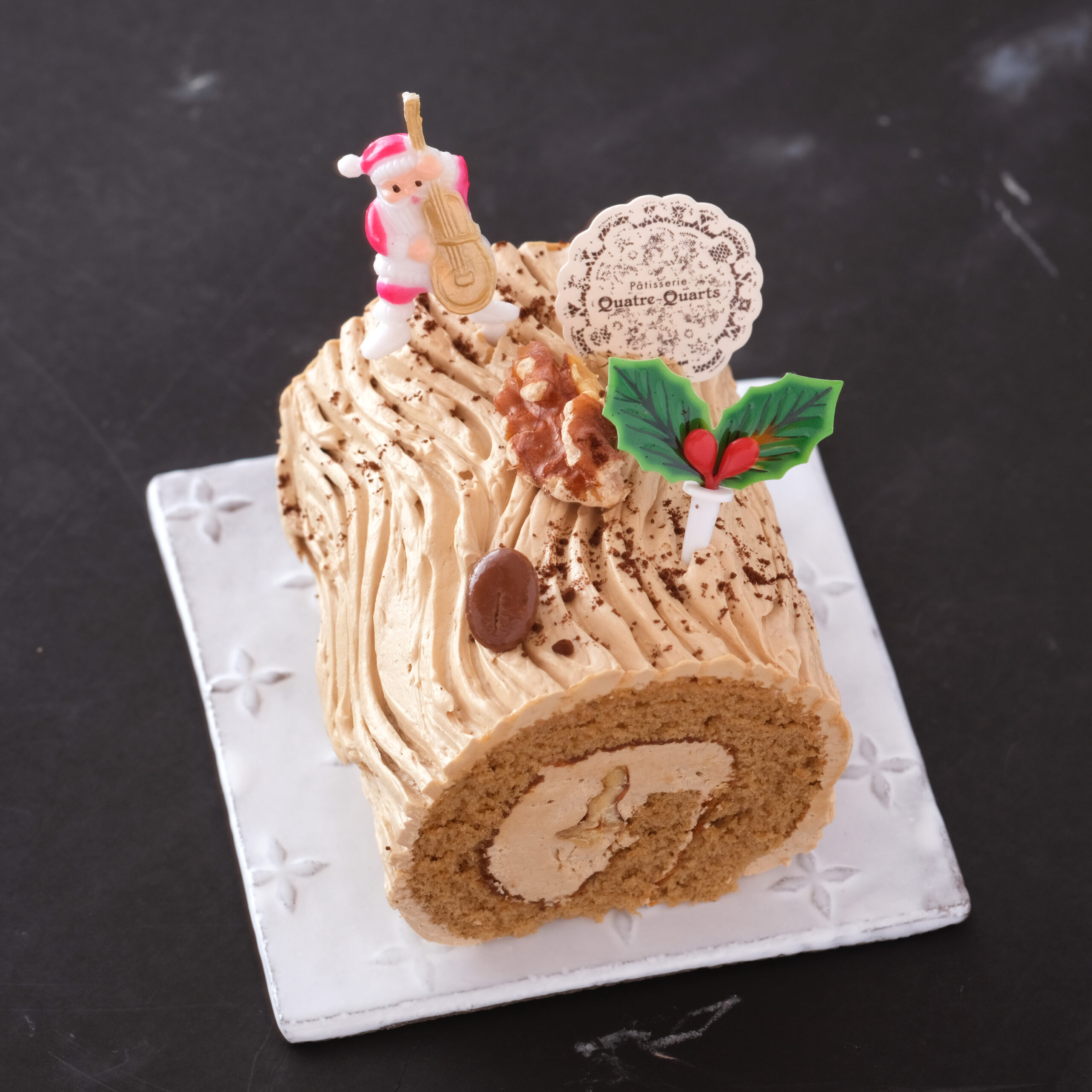 コーヒーのバタークリームとくるみをコーヒーのスポンジで巻いた、おひとり様サイズのビュッシュ・ド・ノエル