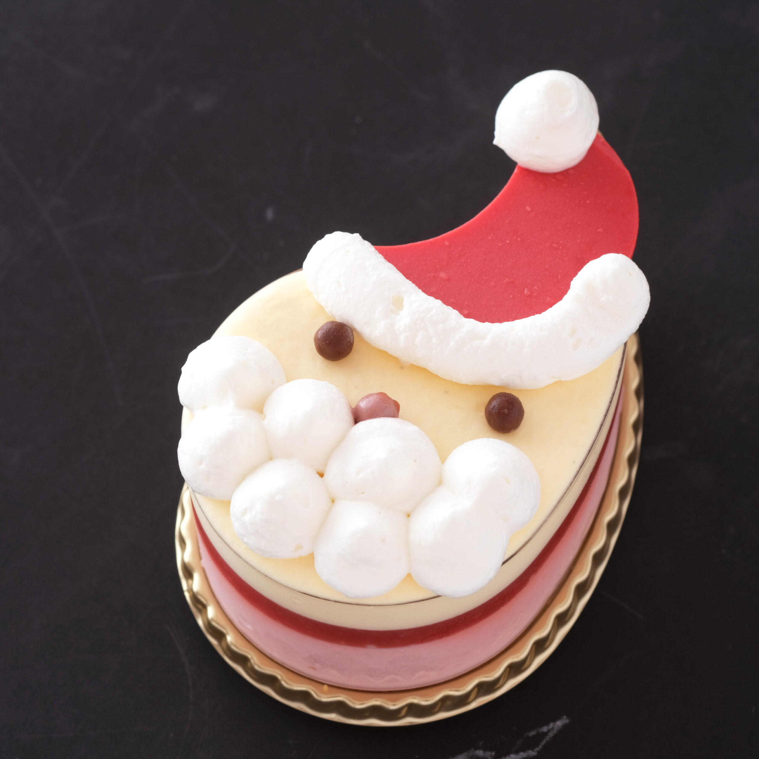 バニラのムース、いちごのムース&コンフィチュール、スポンジを重ねてサンタの形に仕上げました