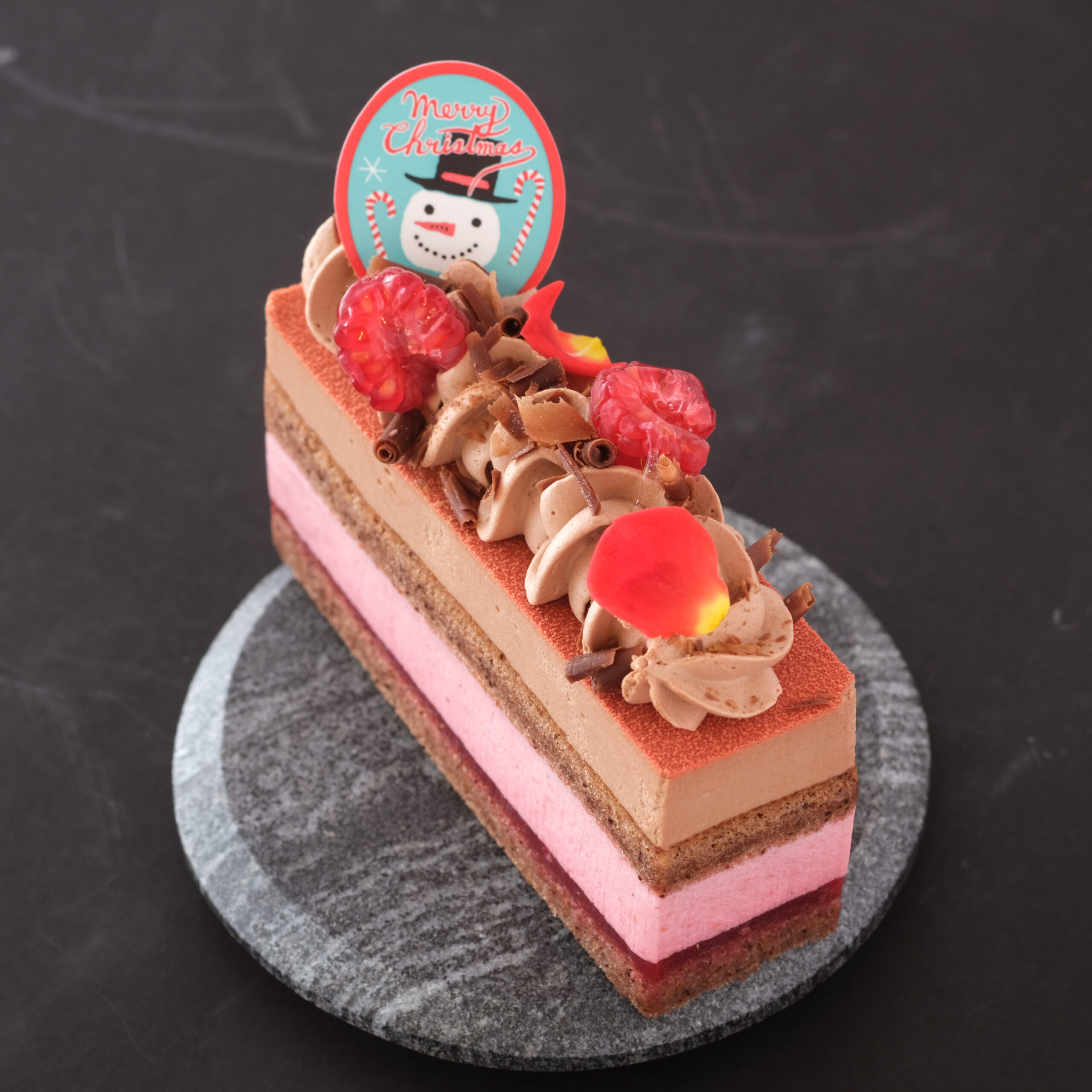 薔薇のフランボワーズのムース&コンフィチュール、チョコレートのムース、ココアの生地を重ねました