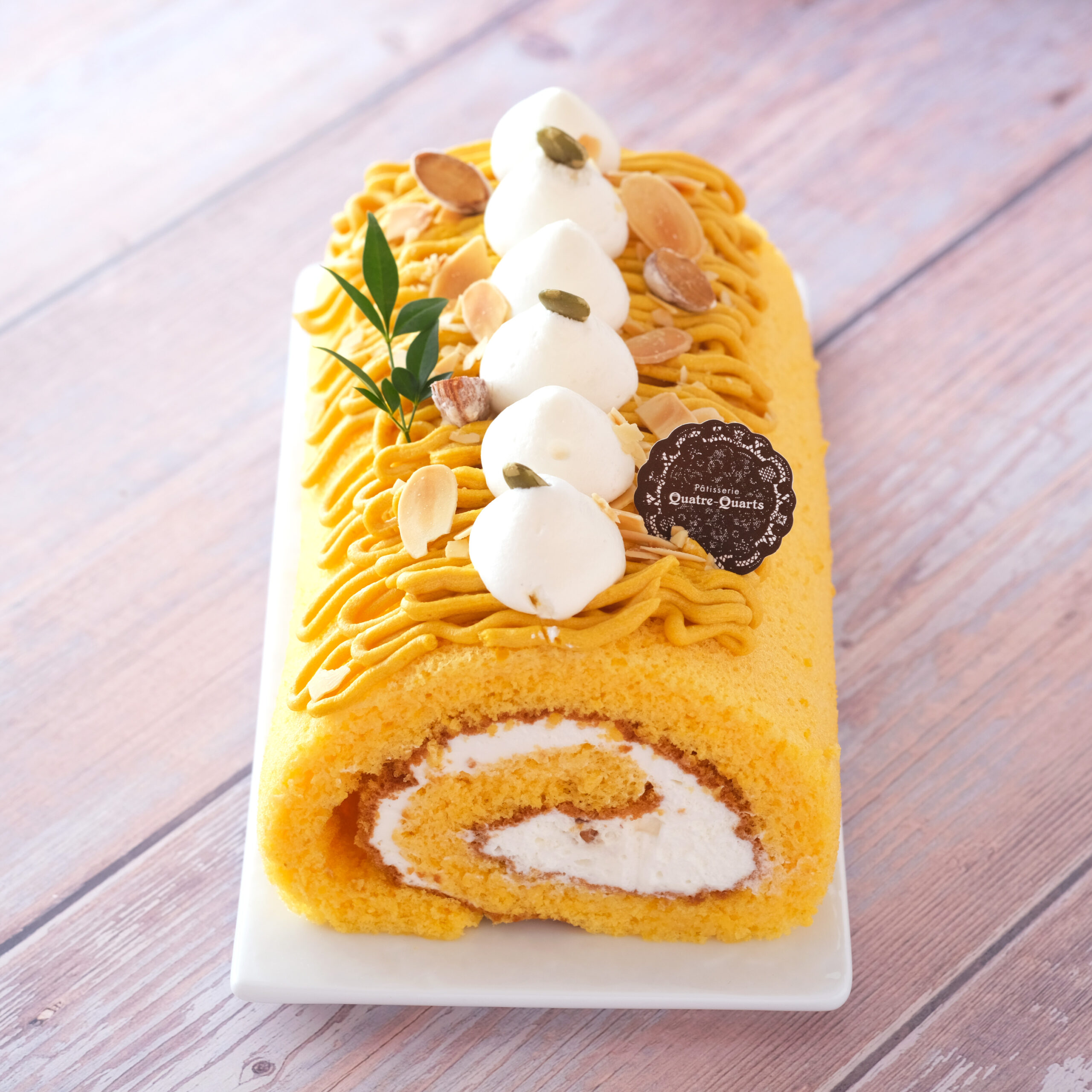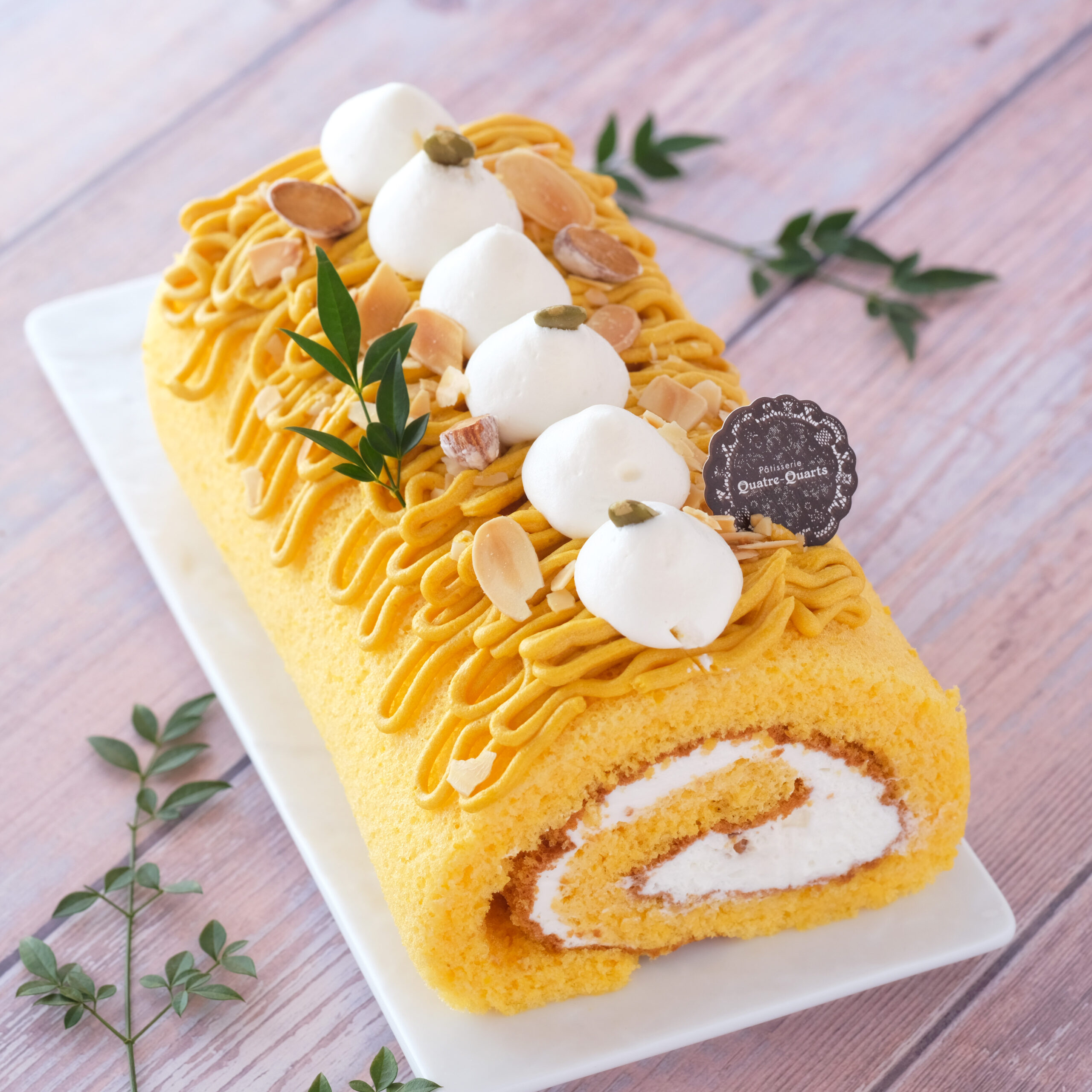 ほんのりかぼちゃが香るスポンジで、キャラメリゼがけしたアーモンドと生クリームを巻き、さらにかぼちゃのクリームを絞りました
